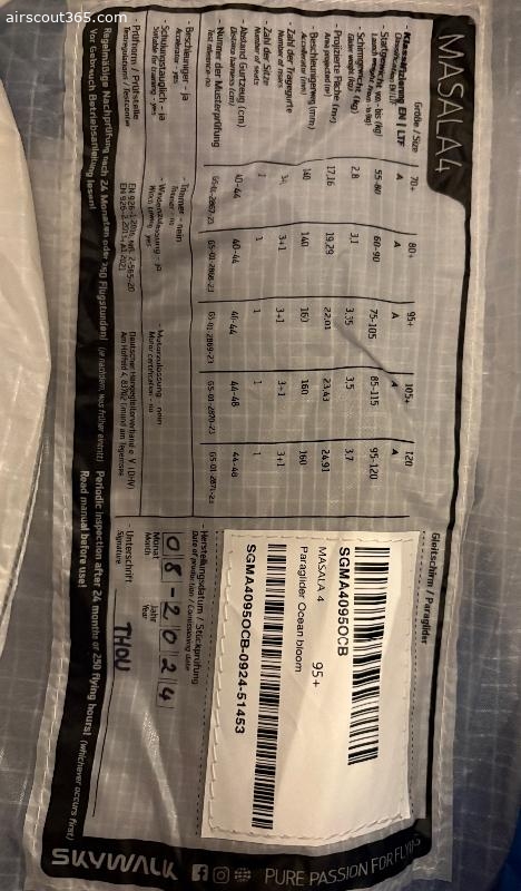 Der Schirm hat Check bis Oktober 2027 und wurde mit sehr guten Zustand bewertet. Aktuell wird er nicht mehr geflogen.